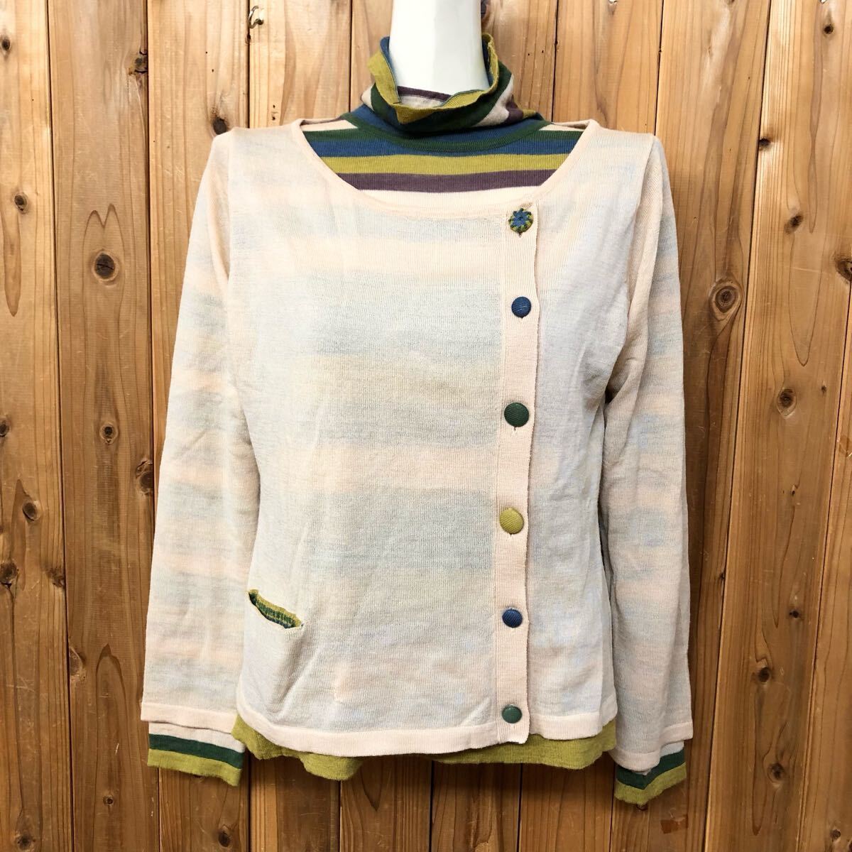 > Jocomomola*ホコモモラ レディース40 長袖 ウール ニット セーター カーディガン ハイネック トップス ボーダー柄×無地 アンサンブル