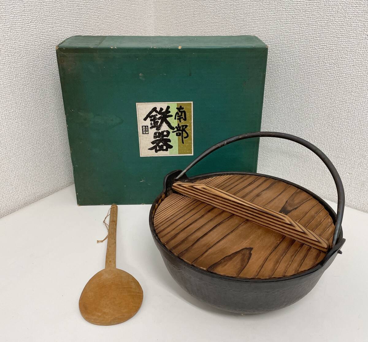 - 【南部鉄器 盛栄堂 丸形ツル付鍋 24cm 木蓋 木杓子付】囲炉裏鍋 鉄鍋 調理器具/A76-211