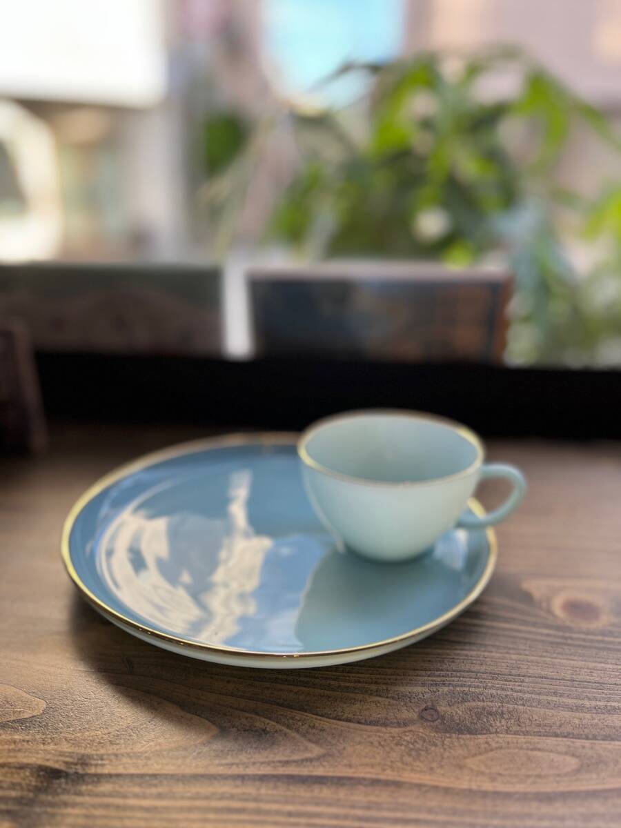 - ファイヤーキング Fire King スナックセット ターコイズブルー ゴールドリム プレート&カップ