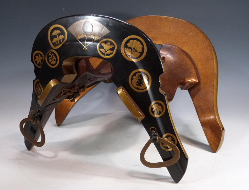 - 《VP》江戸期 古式馬具 黒漆塗金梨地扇子家紋蒔絵 馬の鞍 武具