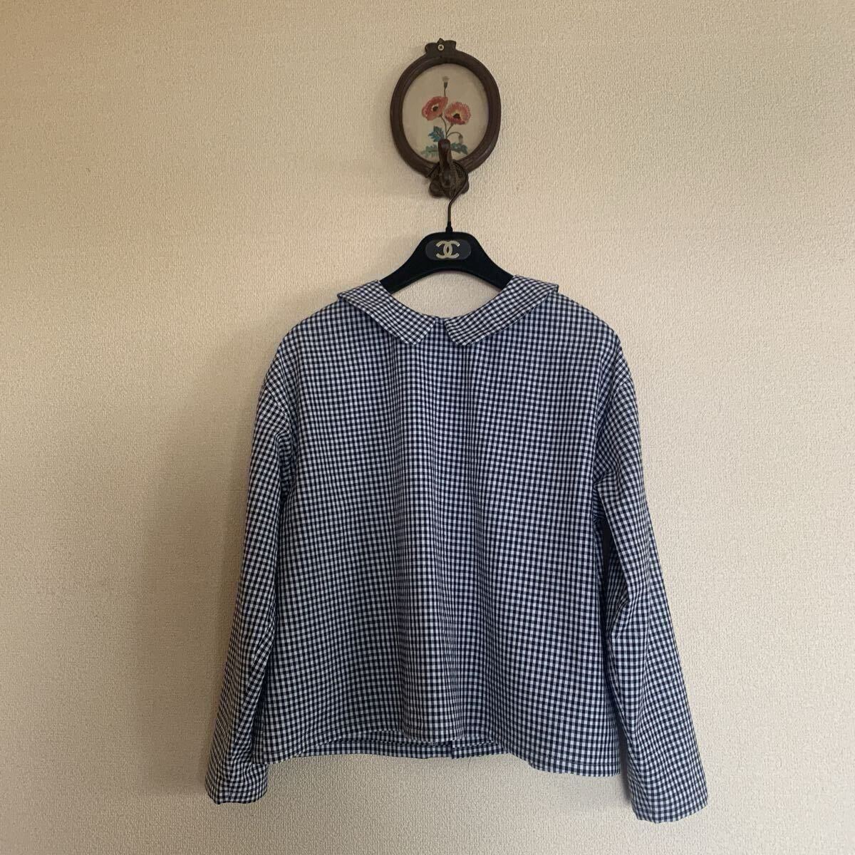 - ☆ハンドメイド☆ギンガムチェック柄 丸襟ブラウス 長袖トップス/M〜 L