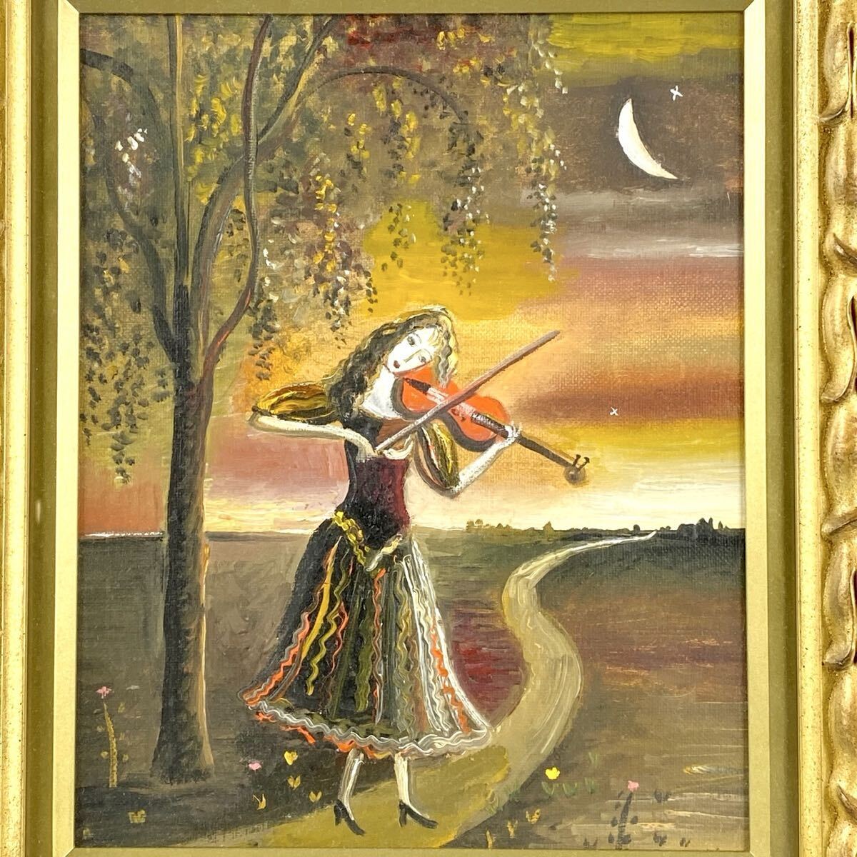 - 猫夢◆ 真作 織田広比古 「赤いヴァイオリンと月」 肉筆油彩3号 タトウ箱 [G35]RR