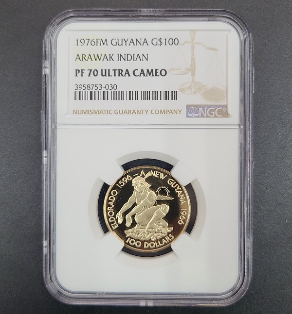 - NGC鑑定 最高評価 PF70 UC 1976年 ガイアナ共和国 100ドル プルーフ金貨 ARAWAK INDIAN コイン スラブケース