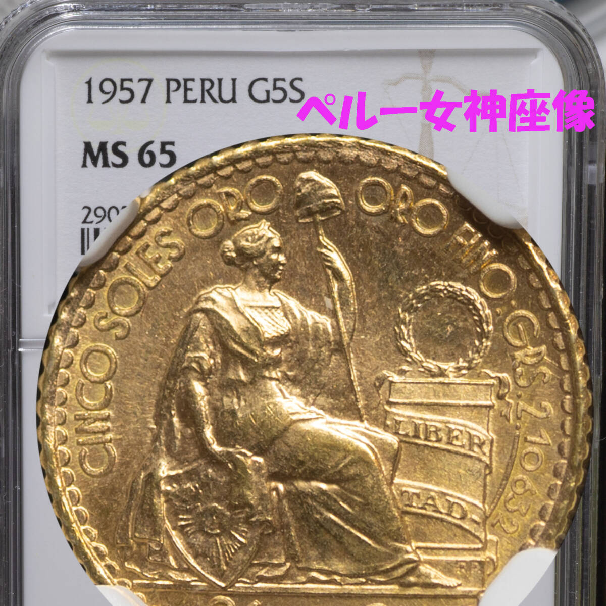 > ★南米の女神 NGC MS65★ペルー 女神の座像 1957年 5ソル 金貨 NGC 第二の雲上の女神 女神座像 自由の女神 NGC シーテッドリバティ送料無料