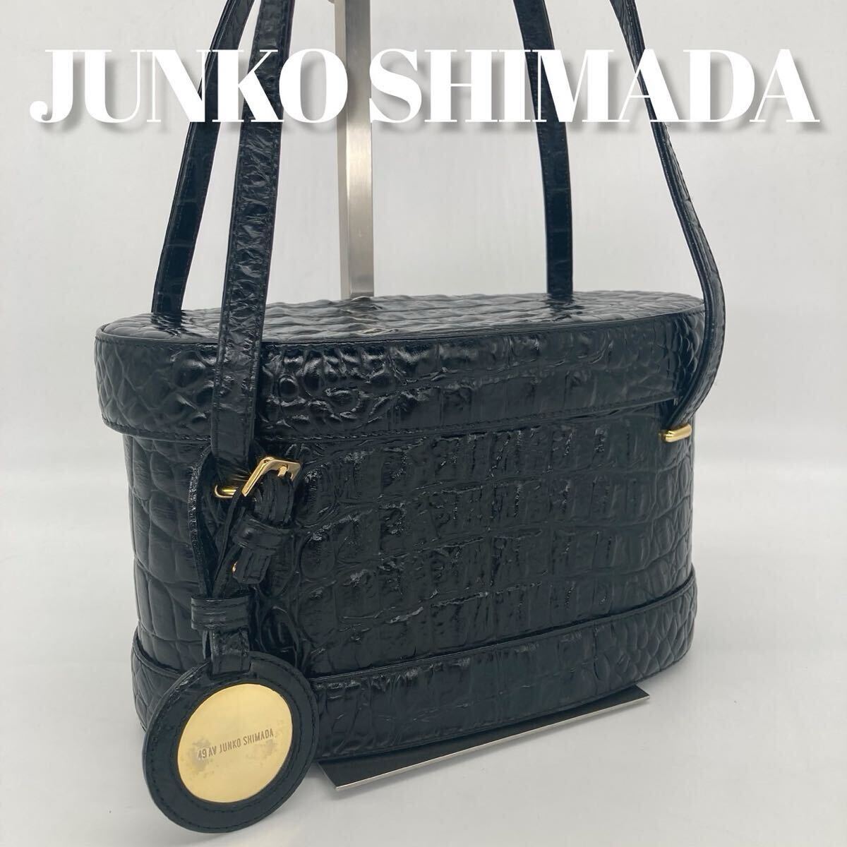 - ジュンコシマダ JUNKO SHIMADA バニティバッグ ハンドバッグ 円形ボックス クロコ型押し レザー 本革 ブラック 黒 チャーム付き レディース