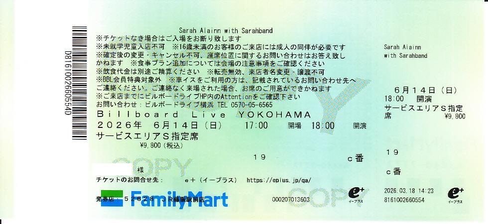 - 【送料無料】サラ・オレイン ビルボードライブ横浜2nd ライブチケット 6/14 S指定席