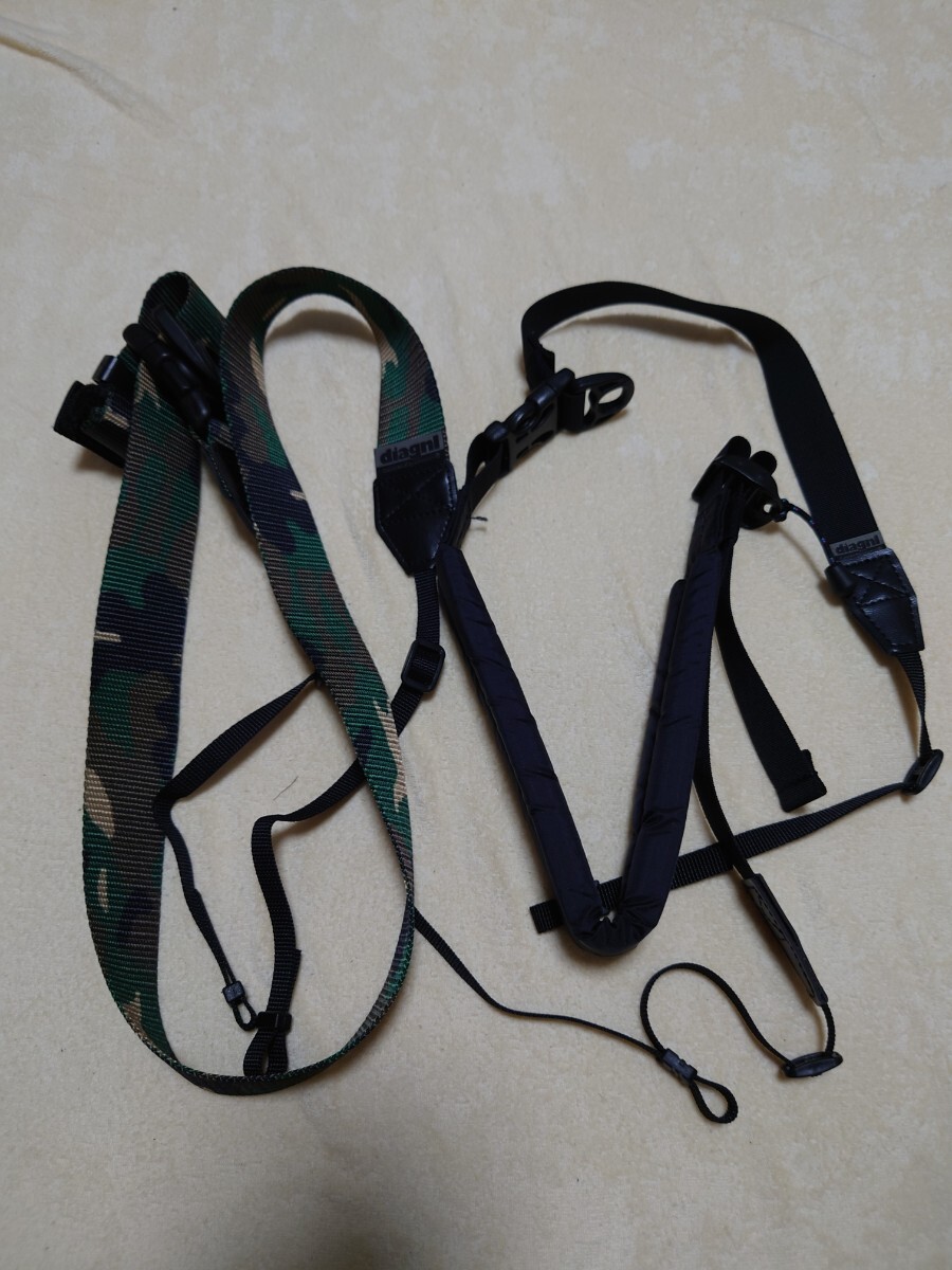> 中古☆超美品☆diagnl☆カメラストラップ☆2個セット☆伸縮自在☆ブラック☆ウッドランドカモ☆アクティブ☆アウトドア☆便利☆使いやすい