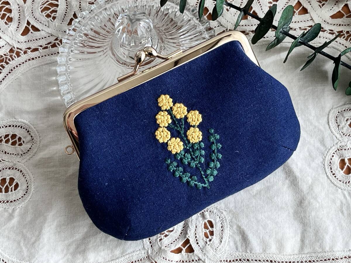 > ハンドメイド+コットンリネン+手刺繍風+ミモザ+希少カラー+ネイビー+植物+花柄+Liberty+ころりん+がま口ポーチ+コスメ+HH+c&s