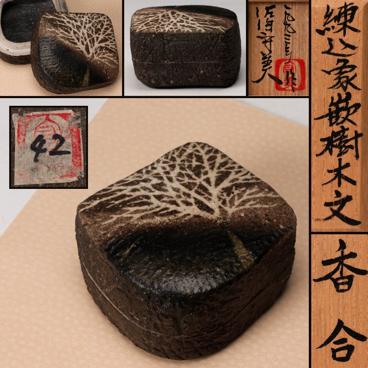 【佳香】佐伯守美 練込象嵌樹木文香合 共箱 栞 茶道具 本物保証拍卖