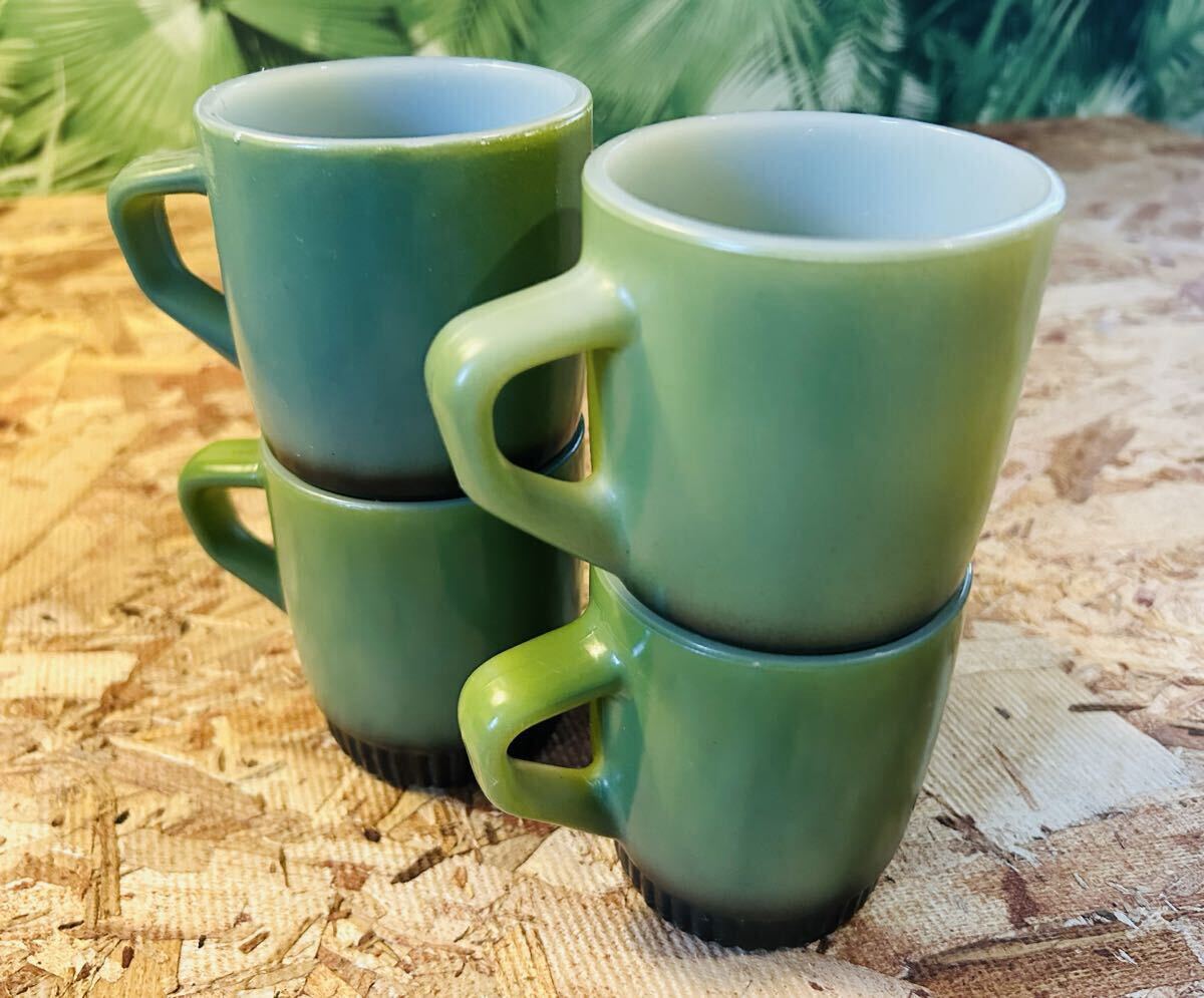 > 70' vintage FIRE KING STACKING MUG GREEN×BLACK ビンテージファイヤーキング リブボトムスタッキングマグ緑×黒 4個セット USA製