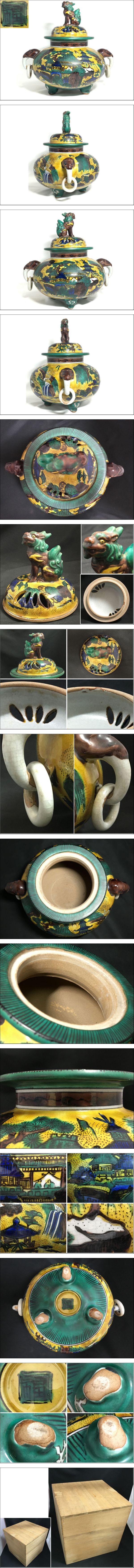 > 未使用!九谷焼 古九谷焼 二重角福銘 福字款 青手遊鐶双耳大香炉 獅子摘み 三つ足大香炉 山水画 風景紋 色絵 古物 高さ約27㎝ 約2.4kg箱付
