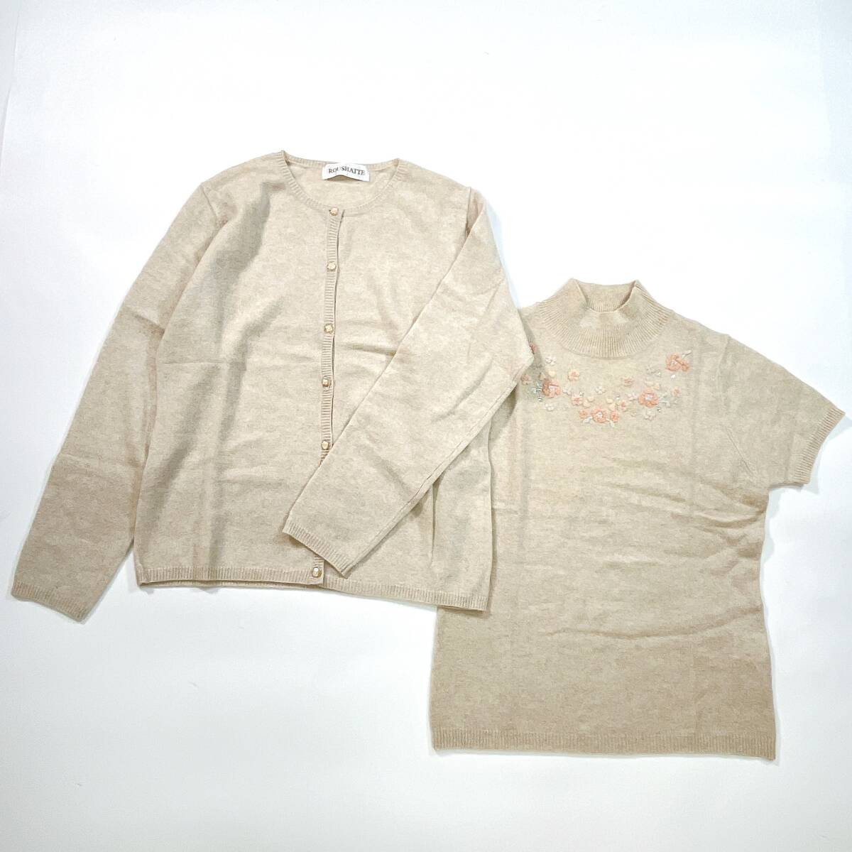 > ROUSHATTE ルーシャット カシミヤ100% ニットアンサンブル 半袖 カーティガン ベージュ系 レディース M 花刺繍 ビジュー付き ☆2034y
