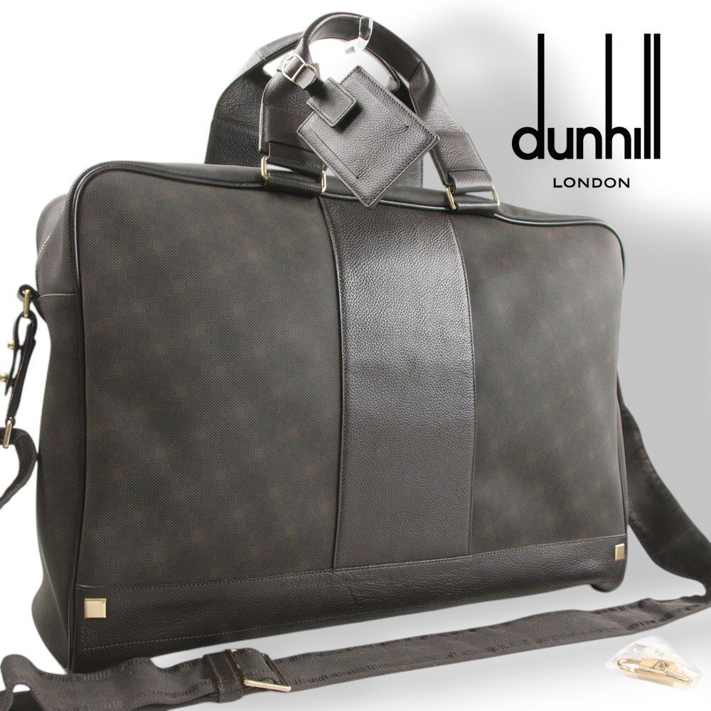 > 極美品 dunhill ダンヒル PVC 仔牛革 カーフスキン 部分レザー ショルダーストラップ付き 2WAY ブリーフケース 茶 【参考価格¥120,000-】