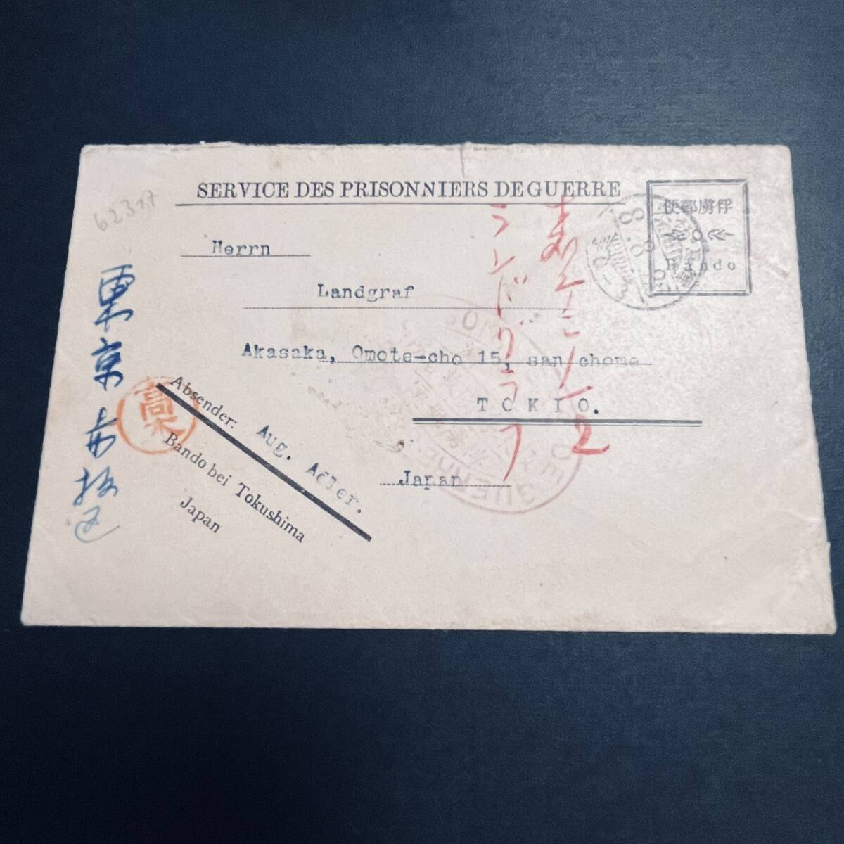 - 日独戦争俘虜郵便使用例 板東俘虜収容所 収容所製封筒使用 櫛型 徳島・板東 1919年 東京宛 内地間使用は少ない 着印 赤坂 エンタイア