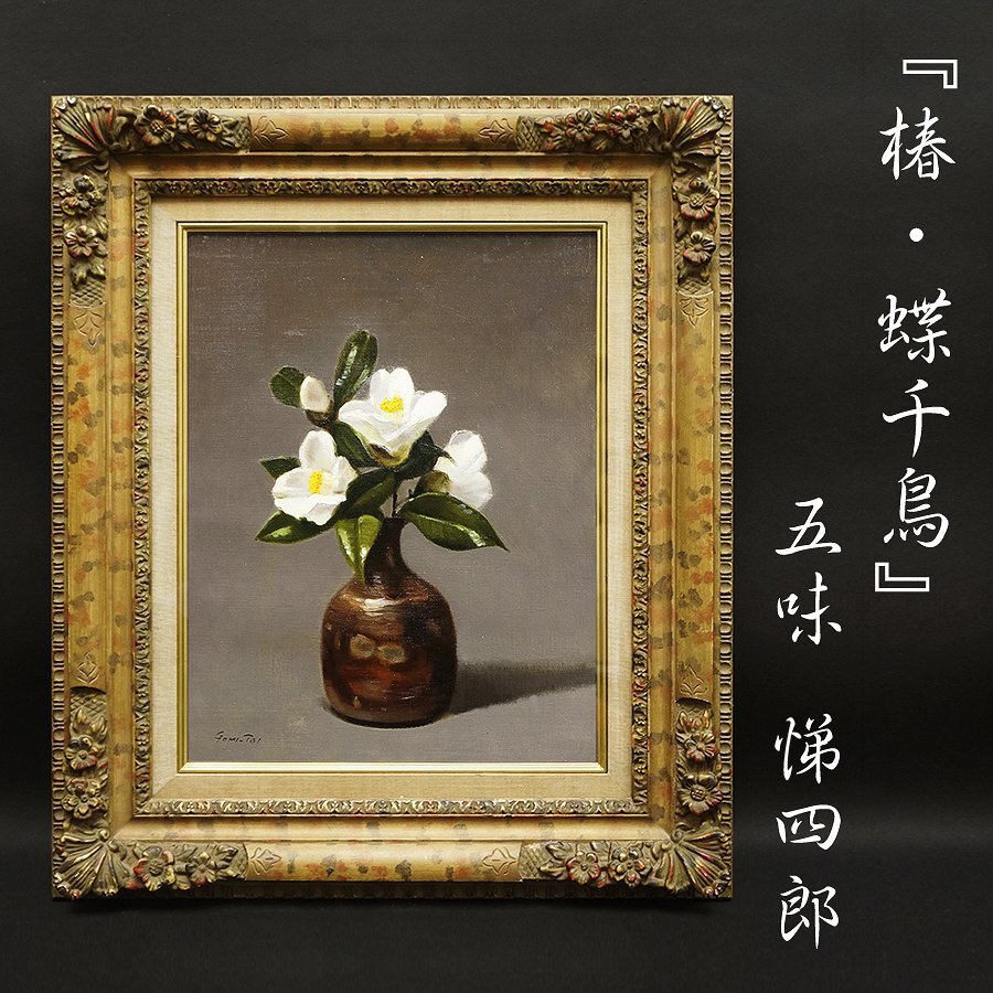 > 五味悌四郎『椿・蝶千鳥』備前壺 リアリズム 秀作 6号 油彩 油絵 原画 直筆 静物画 絵画 額装 美術 芸術 アート 古美術品 真作保証品