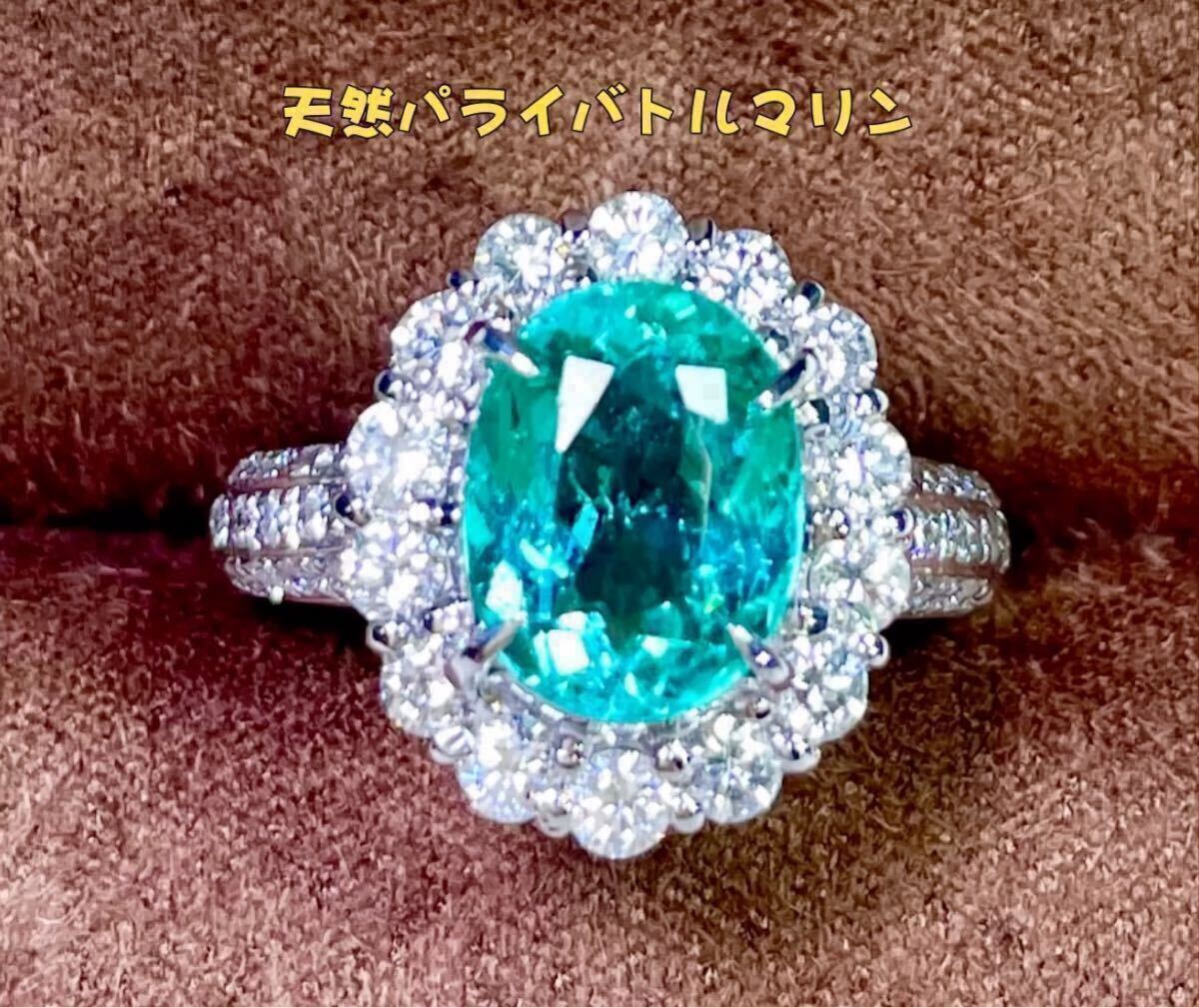 - パライバトルマリンリング 、上質大粒2.413ct、プラチナPT900製 、中央宝石研究所鑑別書付き。