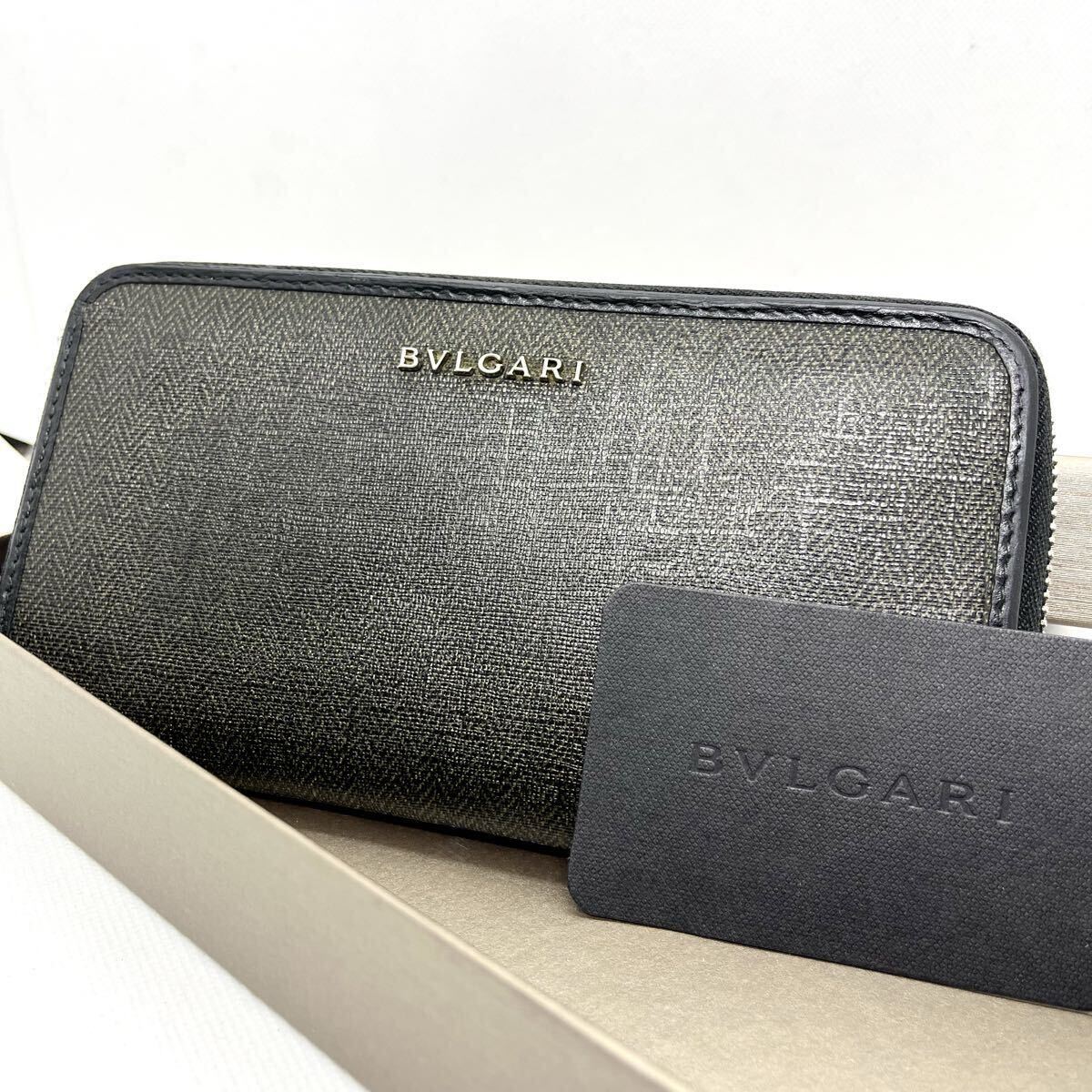 > ● BVLGARI ブルガリ ブルガリマン ウィークエンド 長財布 ラウンドファスナー ラウンドジップ ヘリンボーン 本革 レザー PVC グレー