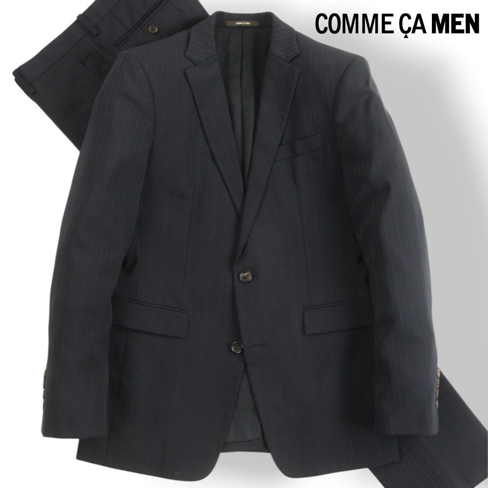 - 極美品 COMME CA MEN コムサメン 春夏生地 ストライプ柄 2つボタン セットアップスーツ 紺 ネイビー 46【参考価格¥53,800-】