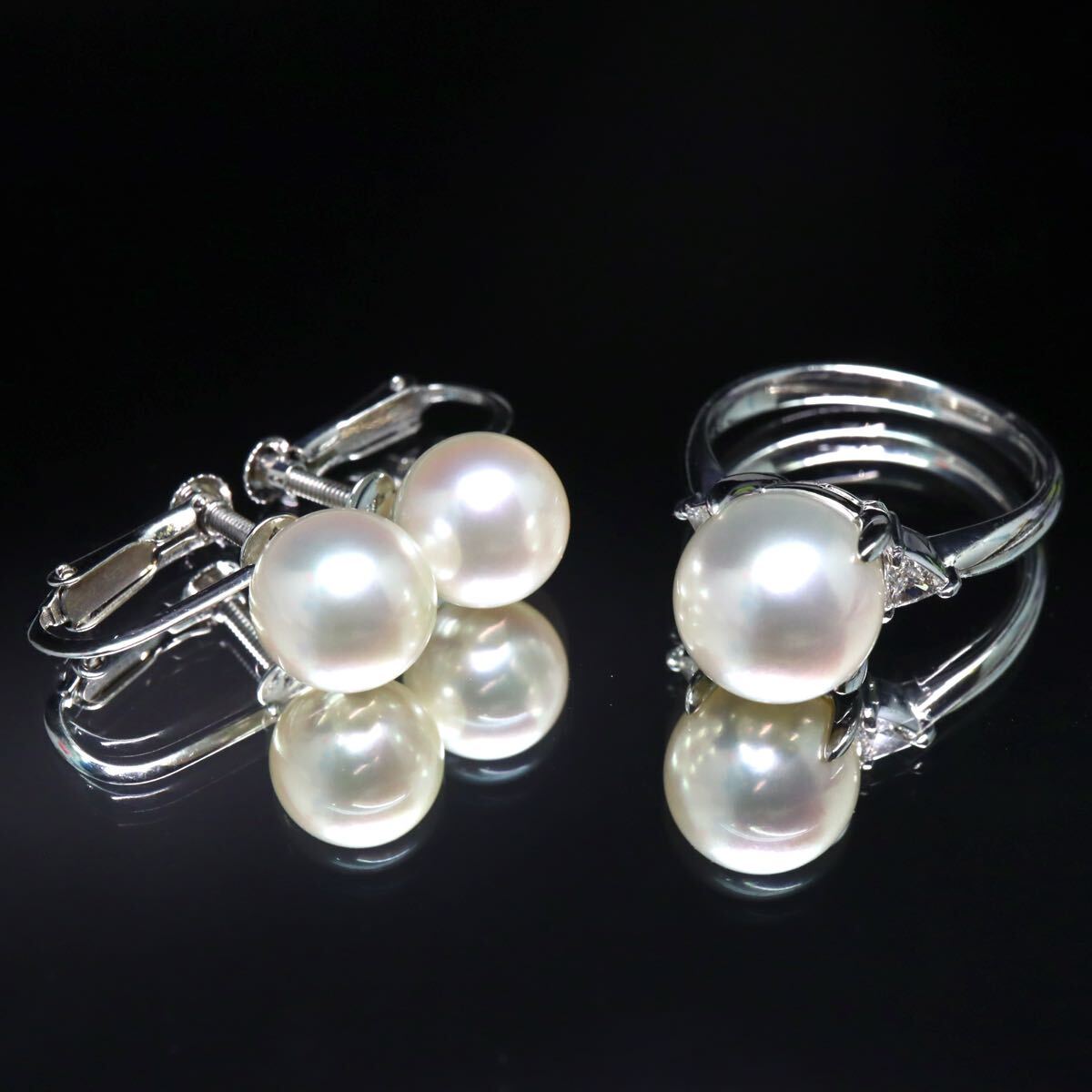 > K14WG/Pt900!!約8.0-9.0mm珠【セット売り】◆アコヤ本真珠リング&イヤリングおまとめ◆A 約8.1g 鑑別書 ダイヤモンド付き EA5/EA9/EF5 X957