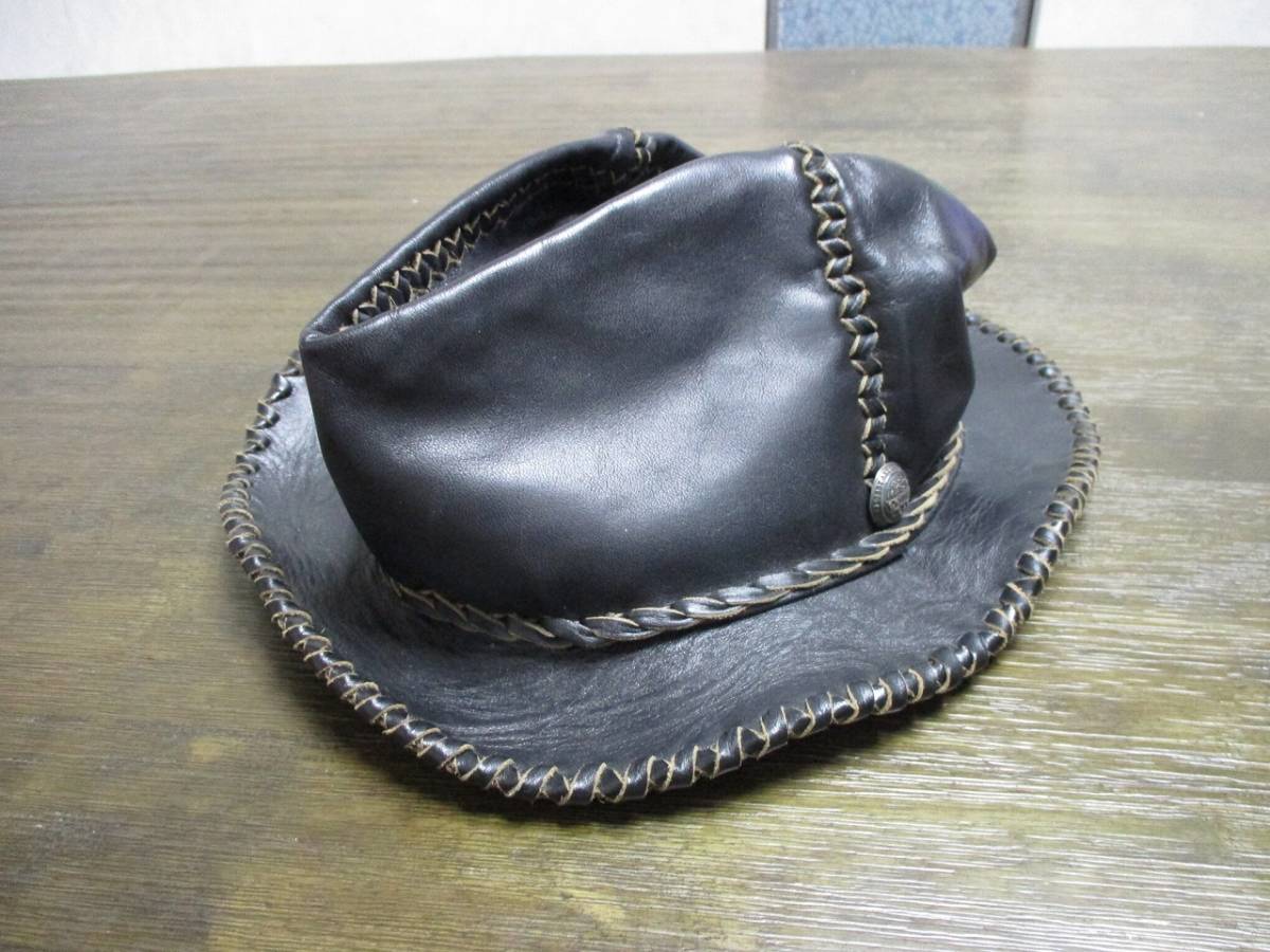 - 特注 高級 本革 レザーハット Black Hand made All Leather Hat オーダーメイド 中折れ レザーハット コンチョボタン 手作り 長渕剛