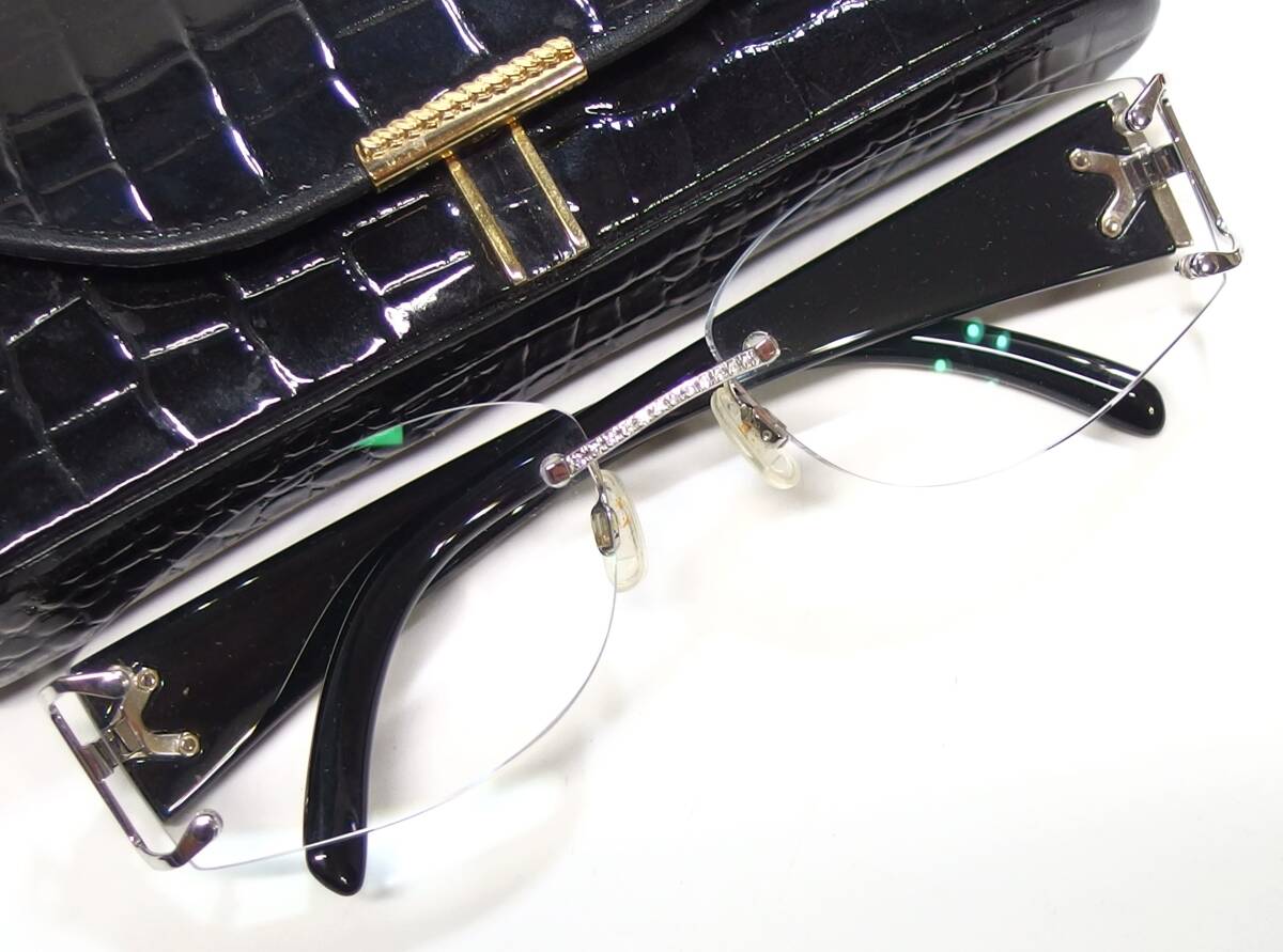 > 【値引交渉歓迎】【新品同様★三越謹製】最高級国産肉厚本べっ甲★K14金無垢&天然ダイヤ★人気真黒甲枠なし眼鏡★ベッコート済2296】