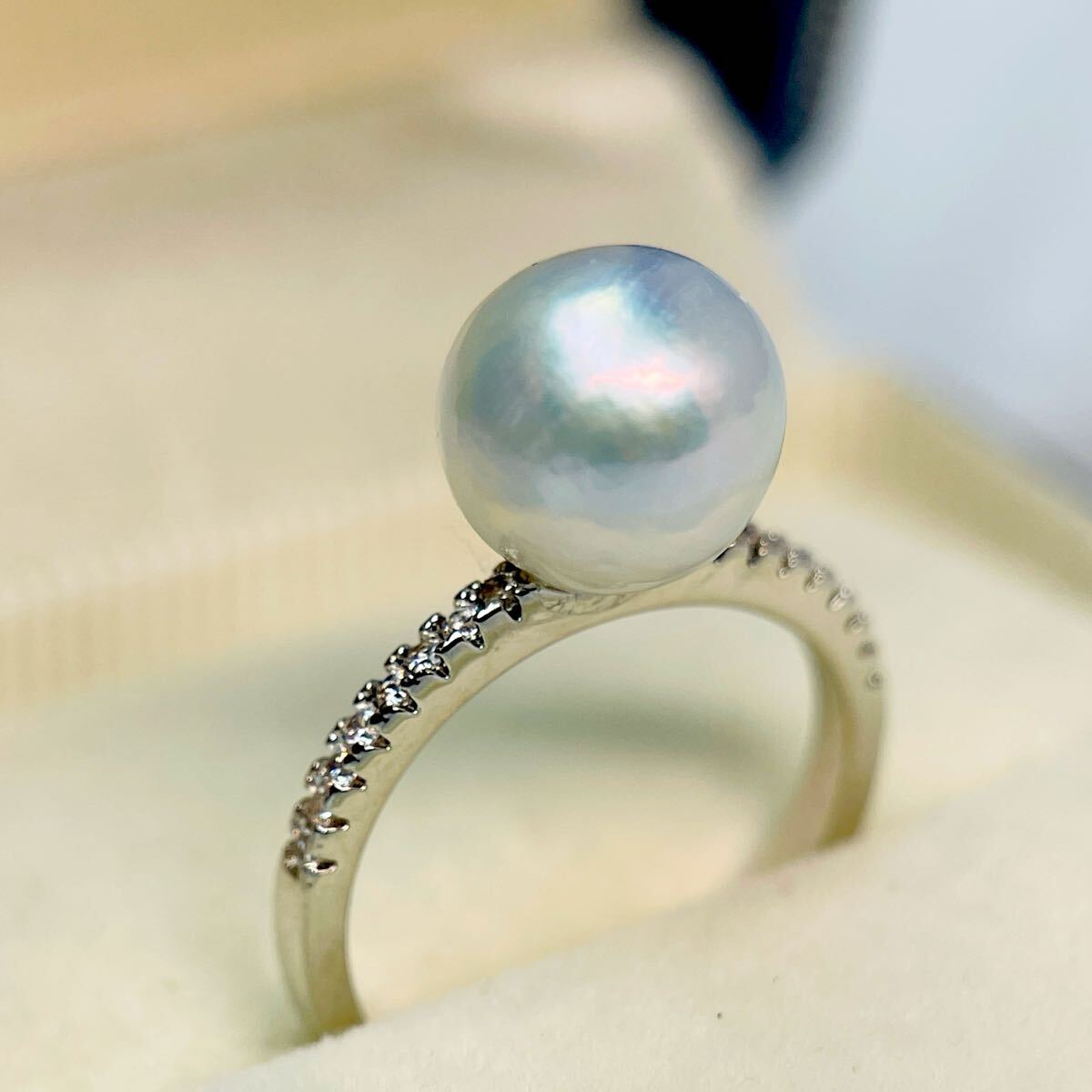 > 本真珠 指輪 リング パールリング 大粒 オローラブルーホワイト 無調色 天然 シルバー パール アクセサリー 10mm