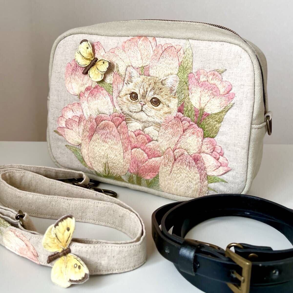 - 手刺繍 モンキチョウと子猫 立体刺繍 エキゾチックショートヘア チューリップ 8号帆布 ショルダーバッグ 持ち手2種 ハンドメイド