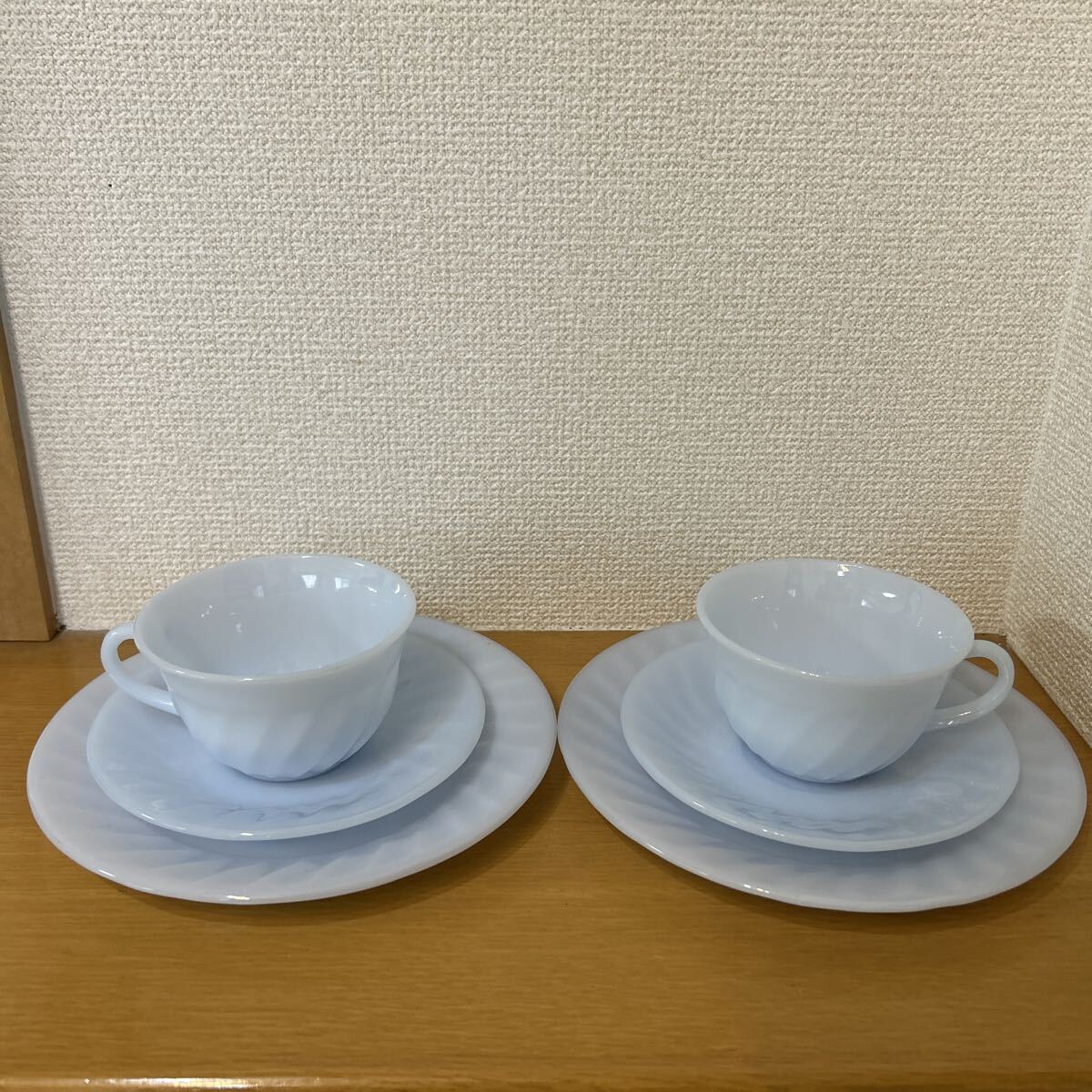 > ファイヤーキング アズライト ブルー トリオ ケーキプレート サラダ カップ&ソーサー 2個セット計6点 スワールシリーズ