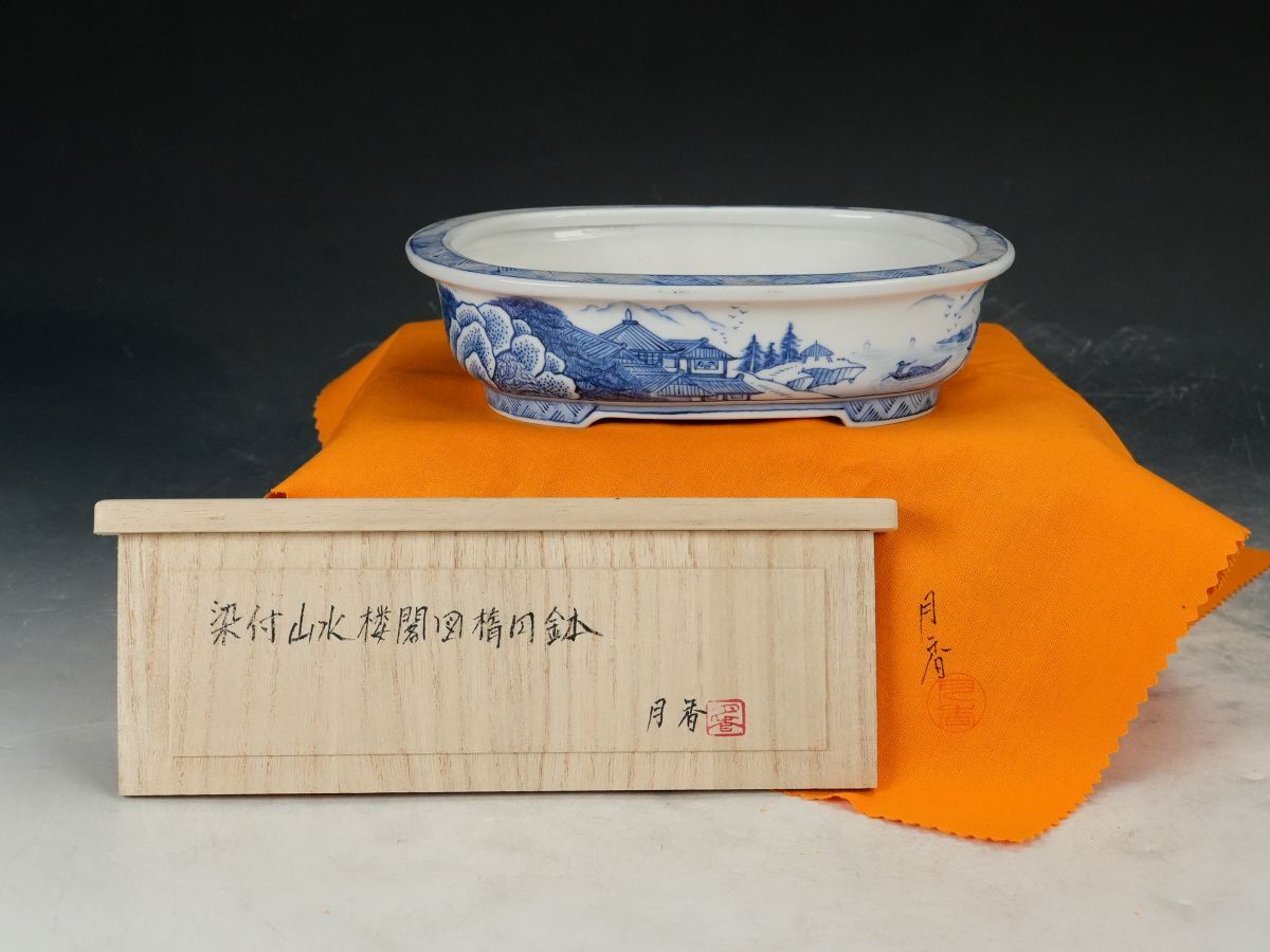 > 【ISBS】人気絵鉢作家 伊藤月香作「月香染付山水楼閣図楕円鉢」共箱共布付 繊細な描写 抜群の成形技術 間口約17.0cm[Y2026032708]