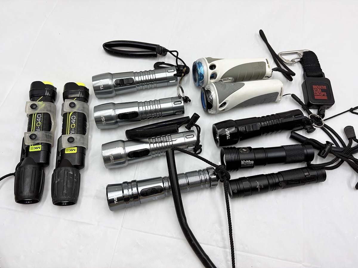 - ★1円 1スタ 水中ライト 11点 セット まとめ LED ダイビング TUSA ツサ UK MINI-Q40 MK2 ジャンク 現状品 3JK27B