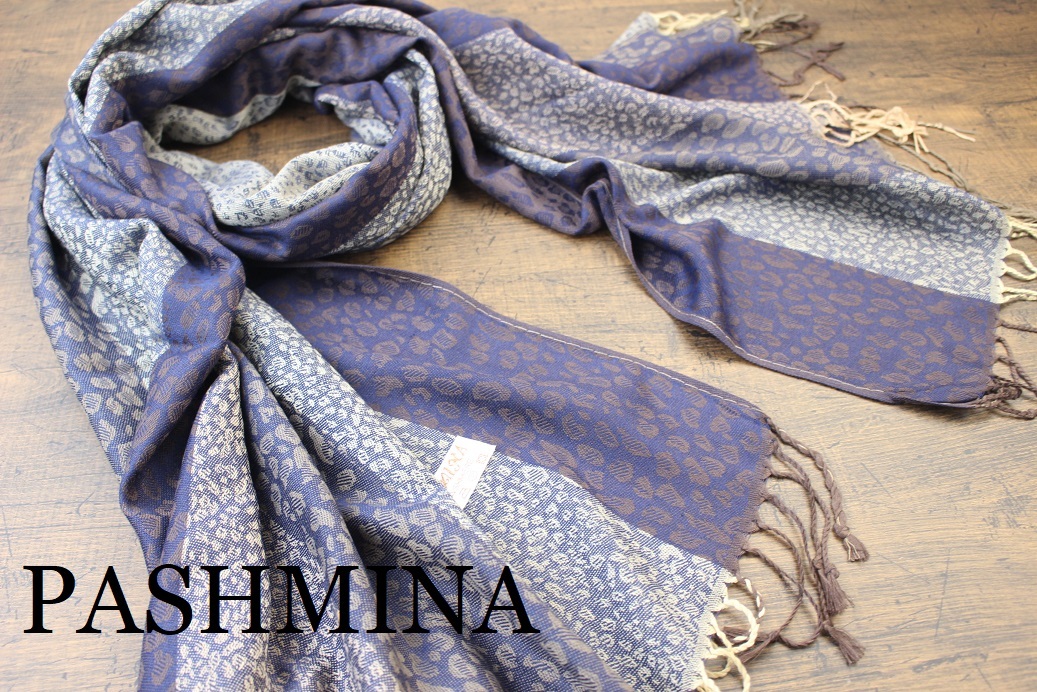 > 新品【パシュミナ Pashmina】レオパード柄 ヒョウ柄 ネイビー系グラデーション 紺 NAVY 大判 ストール カシミア100% Cashmere