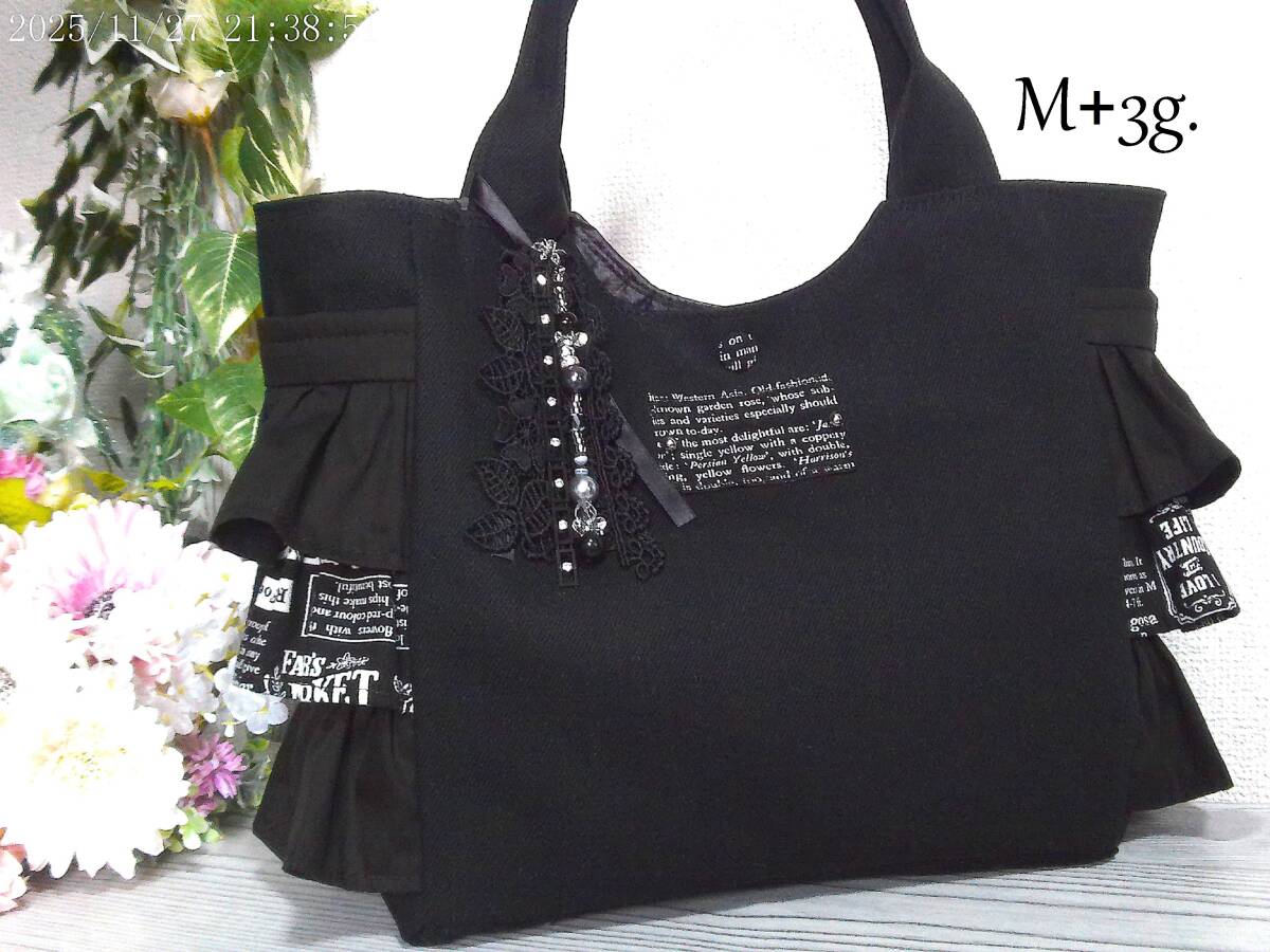 - m+3g. トートバック ハンドメイドバック スクエアートート サイドフリルバック ブラックデニム