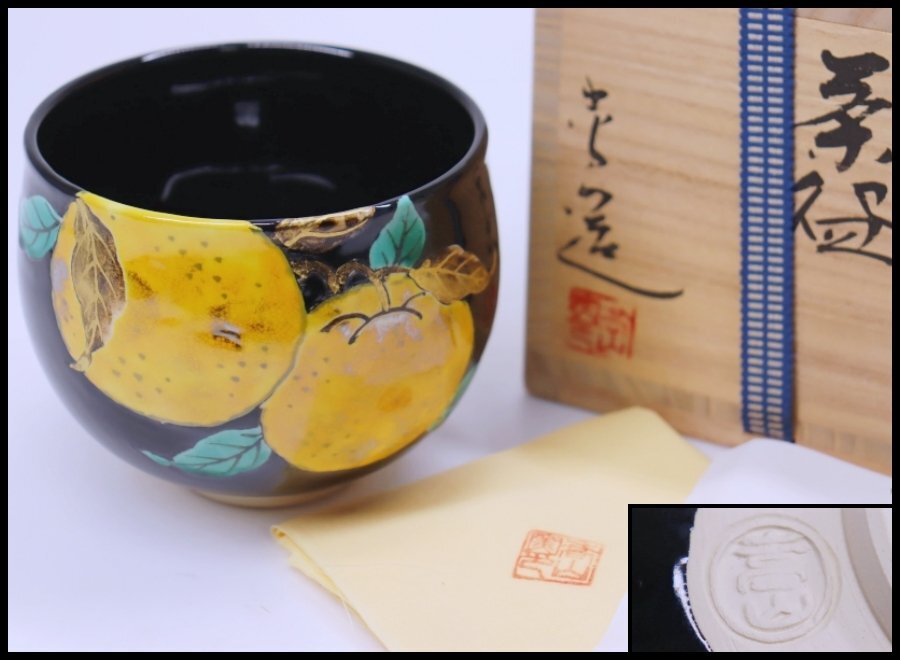 > 茶道具 女流陶芸家 通次嵩山 作 黒釉 色絵 金彩 橙絵 茶碗 共箱 栞 真作保証 通次阿山の妻 / p154