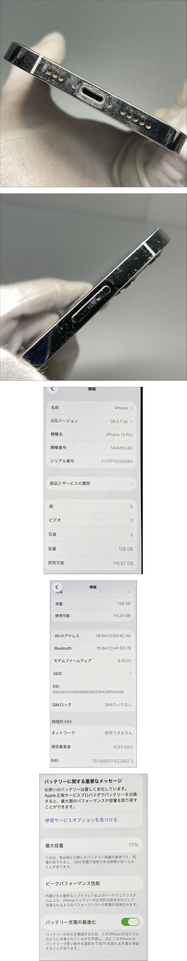 > 2603M3902 Apple アップル iPhone 12 Pro MGM63J/A 128GB IMEI KDDI:〇判定 SIMフリー 通電確認済