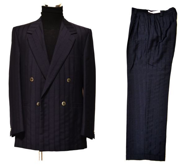 - 209★GIANNI VERSACE★イタリア★ヴェルサーチ★ダークネイビー幅広ストライプ#洒落たデザイン、美しいドレープWのゴージャスなスーツ50/LL