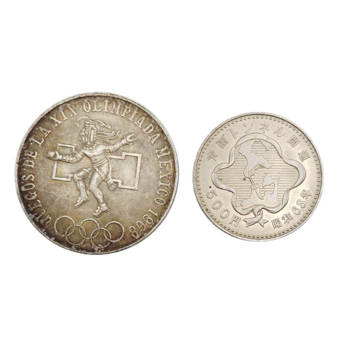 - 記念硬貨 2枚セット 1968年 メキシコ五輪 25ペソ 銀貨 22.5g 昭和63年 青函トンネル開通 500円 硬貨 12.9g 古銭 コレクション 現状品