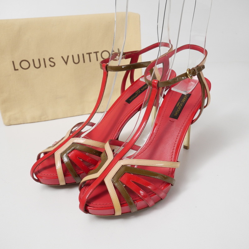> GT3435▼イタリア製 LOUIS VUITTON ルイヴィトン パテントレザー アンクルストラップ サンダル サイズ36 靴 レッド×ベージュ×ブラウン系