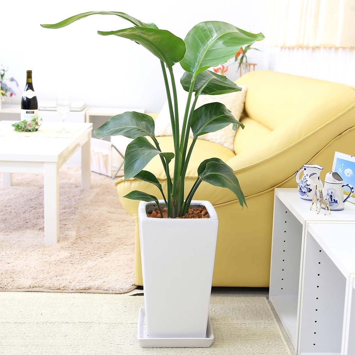 > ストレリチア・オーガスタ 7号 ホワイトスクエア陶器鉢 ストレート+陶器製のお皿付き 土の表面はウッドチップ|観葉植物 風水 ギフト