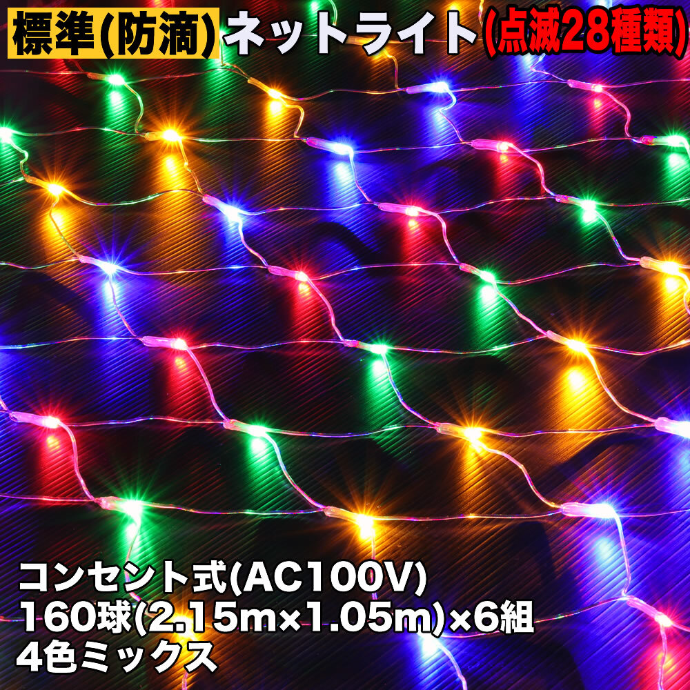 > クリスマス 防滴 イルミネーション ネット ライト 網状 LED 960球 (160球×6組) 4色 ミックス 28種点滅 Bコントローラセット