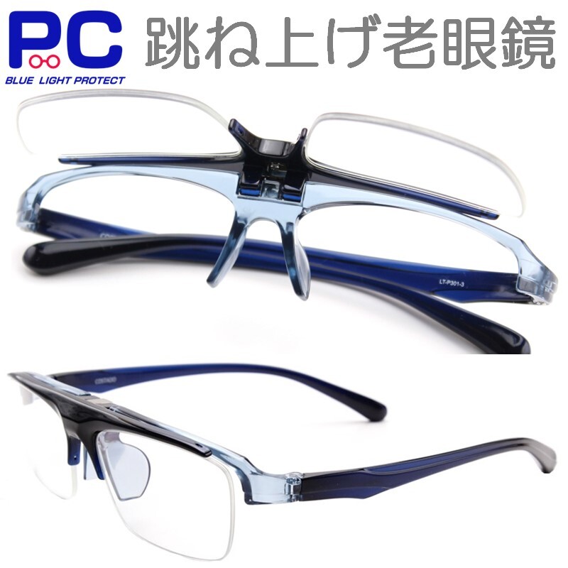 - 度数 +2.5 ブルー/濃い青 跳ね上げ式 老眼鏡 ブルーライト プラスチック シニアグラス FLIP-UP 男性 メンズ 女性 メガネフレーム【HANE】