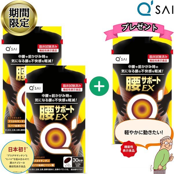 - 期間限定 キューサイ 腰サポートEX 2袋購入で1袋プレゼント 腰の痛み 健康食品 サプリメント 腰痛 アスタキサンチン サポート ヒハツ 筋肉