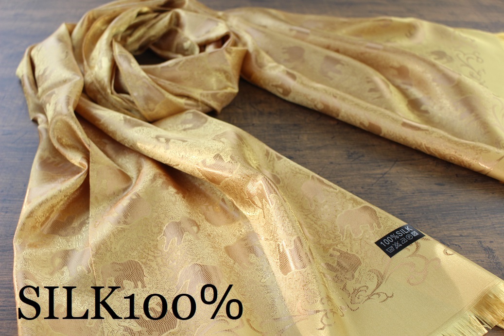 - 新品【シルク100% SILK】エレファント柄 象柄 ゴールド 金 GOLD 大判 ストール/スカーフ