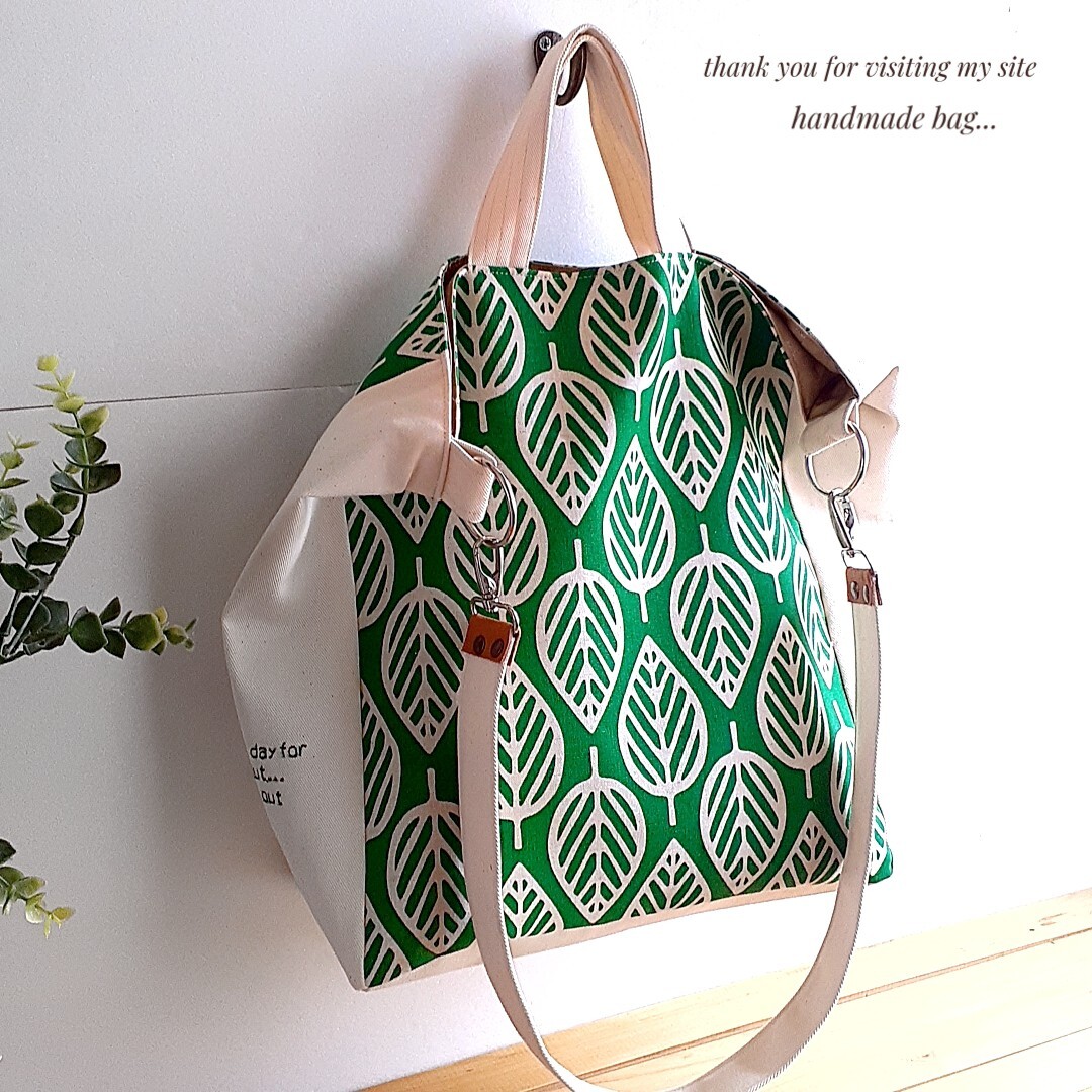 - 49R8♪国産セルヴィッジデニムネップあり生成りと綿麻リーフ柄の2way持ち手のくったり縦長トート♪