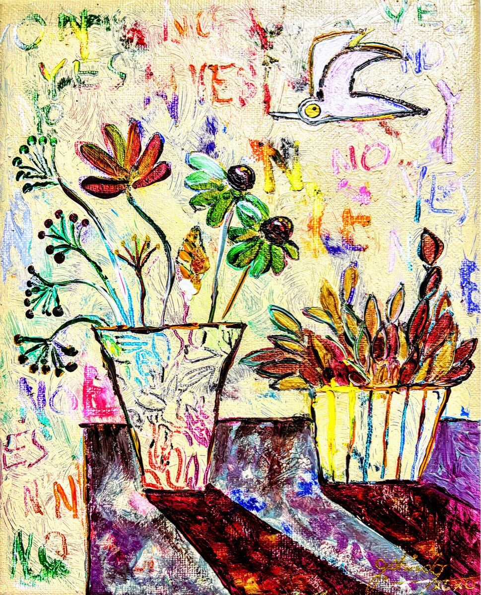 > 【新藤淑子】真作保証。1点物。原画。絵画。直筆サイン。キャンバスF3号。静物画。花。アクリル画。『YES ーNO』