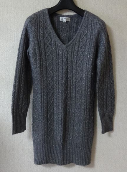 > MICHEL KLEIN ミッシェルクラン セーター Vネック チュニック丈 グレー ケーブル編み マフラー付き 38サイズ ★