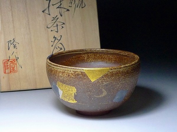 - 60HT136★九谷焼 竹隆窯 北村隆作 金彩抹茶碗 金銀箔 灰釉 共箱 抹茶碗 茶器 陶器 陶芸 伝統工芸 茶陶 茶事 抹茶 骨董
