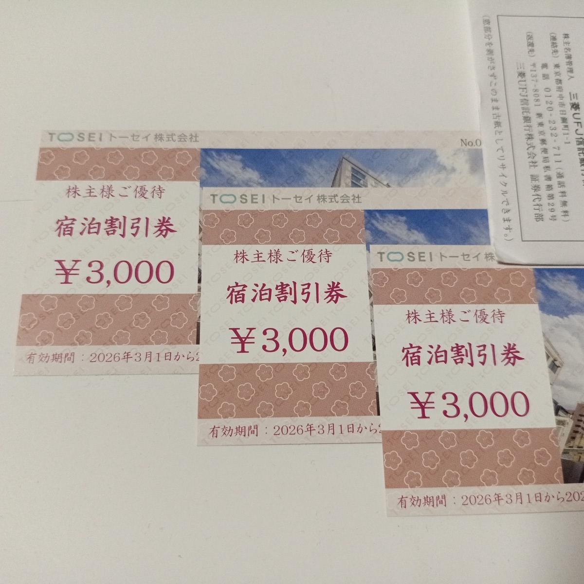 - ■トーセイ 株主優待 9,000円分 TOSEI 宿泊割引券