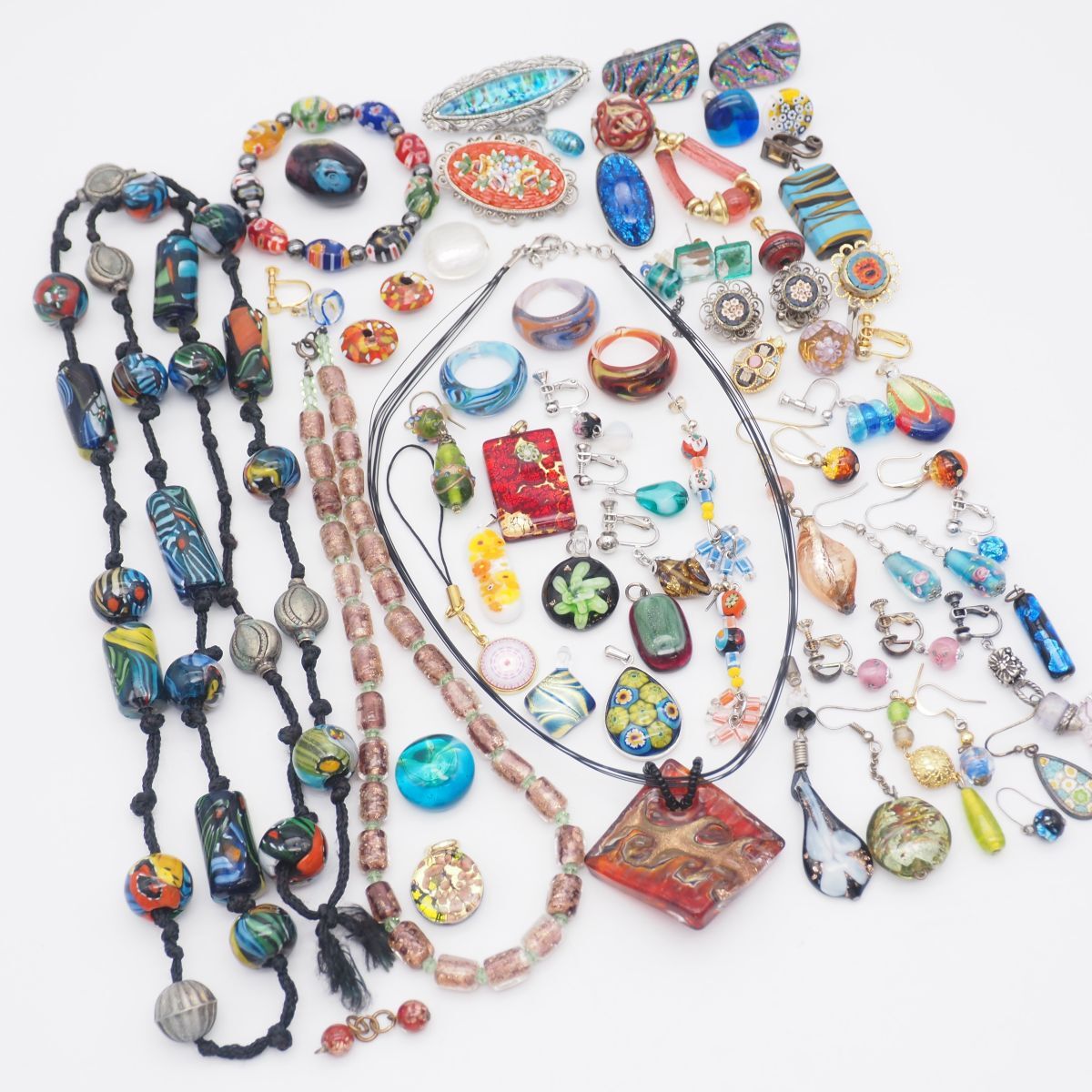 BMM0307 1円 ガラス アクセサリー 大量セット ベネチアン モザイク ネックレス ペンダントトップ イヤリング ブローチ 指輪 等 まとめて