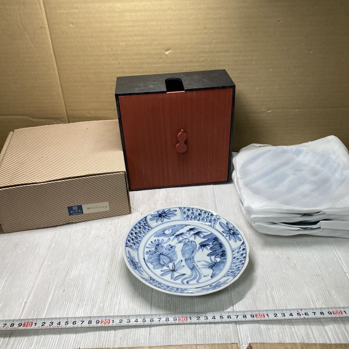 - 龍峰窯 染付花鳥 和皿揃 林齋 5枚組 未使用長期保管品 専用木箱 和食器 食器 皿 染付 陶器 中皿 陶磁器 取り皿