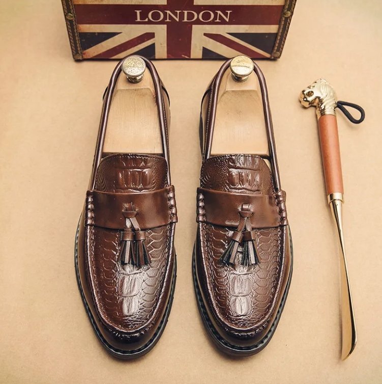 - 新しいファッションクロコダイル革のカジュアルシューズ春と秋の個性的なフリンジの尖った革靴英倫の潮流色拭きスリーブの男性靴